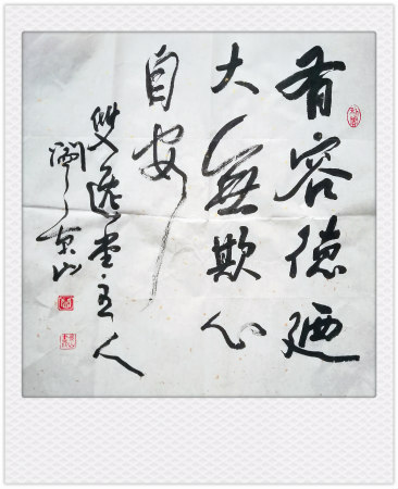 书法里蕴含着阎景山老师的人生,常常听到“字如其人”的说法,这句话是说,从一个人的写字可以看出一个人的性情,字如其人,亦如人生,而我始终认为书法更是人生写照。字是人写出来的,一长一短,一横一竖,一撇一捺;人生也是人用行动写出来的,一旦一夕,一张一弛,一善一恶。人生百态,我们当从中启迪人生,感悟人生。阎景山老师的作品中,不论是笔的走势,线墨条,还是书写内容,总透出浓淡相宜,挥洒自如的雅致:“名缰利锁非吾愿“,“庭草经霜老更绿”,“人生当效东篱菊”,泽被万物而不争名利,上善若水,执笔写的都是自己的人生旅程,字味如人生。