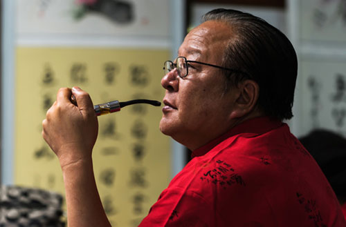 谈到兴奋处,书画家穆振庚更是亲自操起了画笔,现场为媒体工作者进行艺术创作创作。
