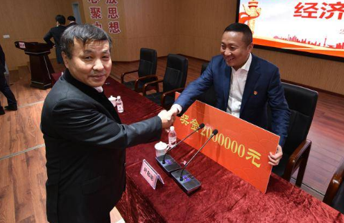 2020年4月19日,江西耐普矿机新材料股份有限公司董事长郑昊,从上饶经济技术开发区管委会书记叶和彬手上接过200万元现金奖励牌。