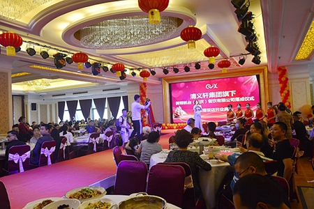 重庆清义轩集团创始人关青国,管理层:刘俊、汤泽健、石悦、赵孝娅、陈绍君、秦永、蹇能友,涪陵区餐饮商(协)会副会长魏溶峰,VIP客户代表近300人共同见证了美顿帆台(重庆)餐饮有限公司的落成仪式暨金禧饭店的开业庆典活动。(陈孝波)