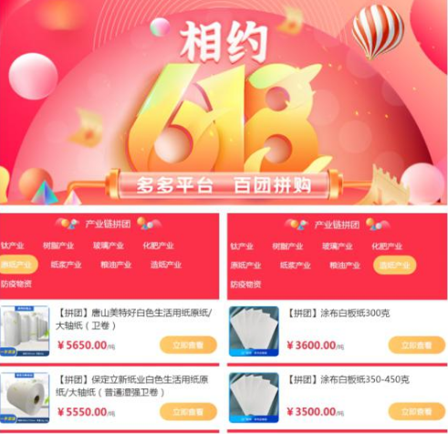618加上B端的工业品会是怎样的画风呢?多多电商立足B端,同步备战618!多多电商“相约6.18百团拼购”活动专区包括钛产业、醇产业、树脂产业、玻璃产业、原纸产业、化肥产业、粮油产业、纸浆产业、造纸产业(纸多多)等核心原材料拼团板块,及防疫物资拼团板块,以拼购优惠价格满足产业链用户采购需求的活动。