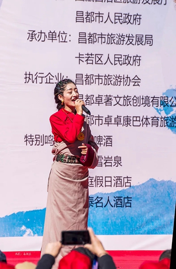 在昌都地区小有名气的藏族歌手德青用她甜美高亢的歌喉演唱昌都旅游主题歌曲《传奇昌都》。