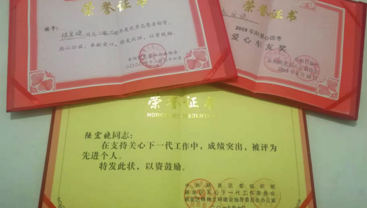 捧着一颗心来,不带半棵草去。奉献应该成为这个世界的主流,成为一种自觉行为。陆宏晓连续多年被阜阳阳光爱心公益协会评为优秀志愿者,2019年10月还被中共颍泉区委组织部、颍泉区关心下一代工作委员会、颍泉区精神文明建设指导委员会评为先进个人。“有所作为是生活中的最高境界,只有努力去减少别人的苦难,你才会快乐。”向社会公益人学习,奉献社会“益”起来!(陈代卿 魏振强)