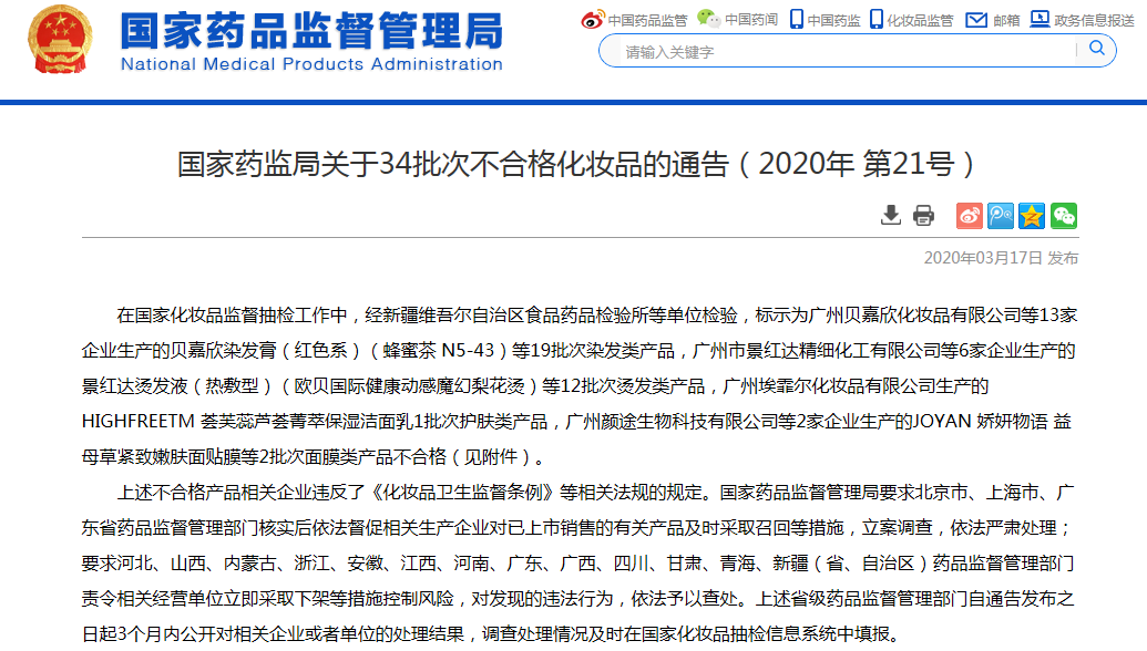 市场舆情网 据《国家药监局关于34批次不合格化妆品的通告(2020年 第21号)》消息,经新疆维吾尔自治区食品药品检验所及江西省药品检验检测研究院检测,广州贝嘉欣化妆品有限公司...